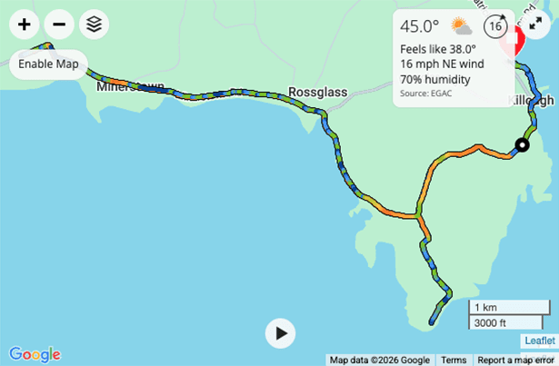 Your journey begins in the charming coastal village of Killough, where runners will set off from the picturesque village green. The course starts on the pretty Main Street before turning right onto a peaceful country road leading toward Rossglass. Here, 10K runners are rewarded with an awe-inspiring view of the Mourne Mountains sweeping down to the sea—a truly unforgettable sight. At this point, 10K runners will turn back, retracing their steps to the finish line.